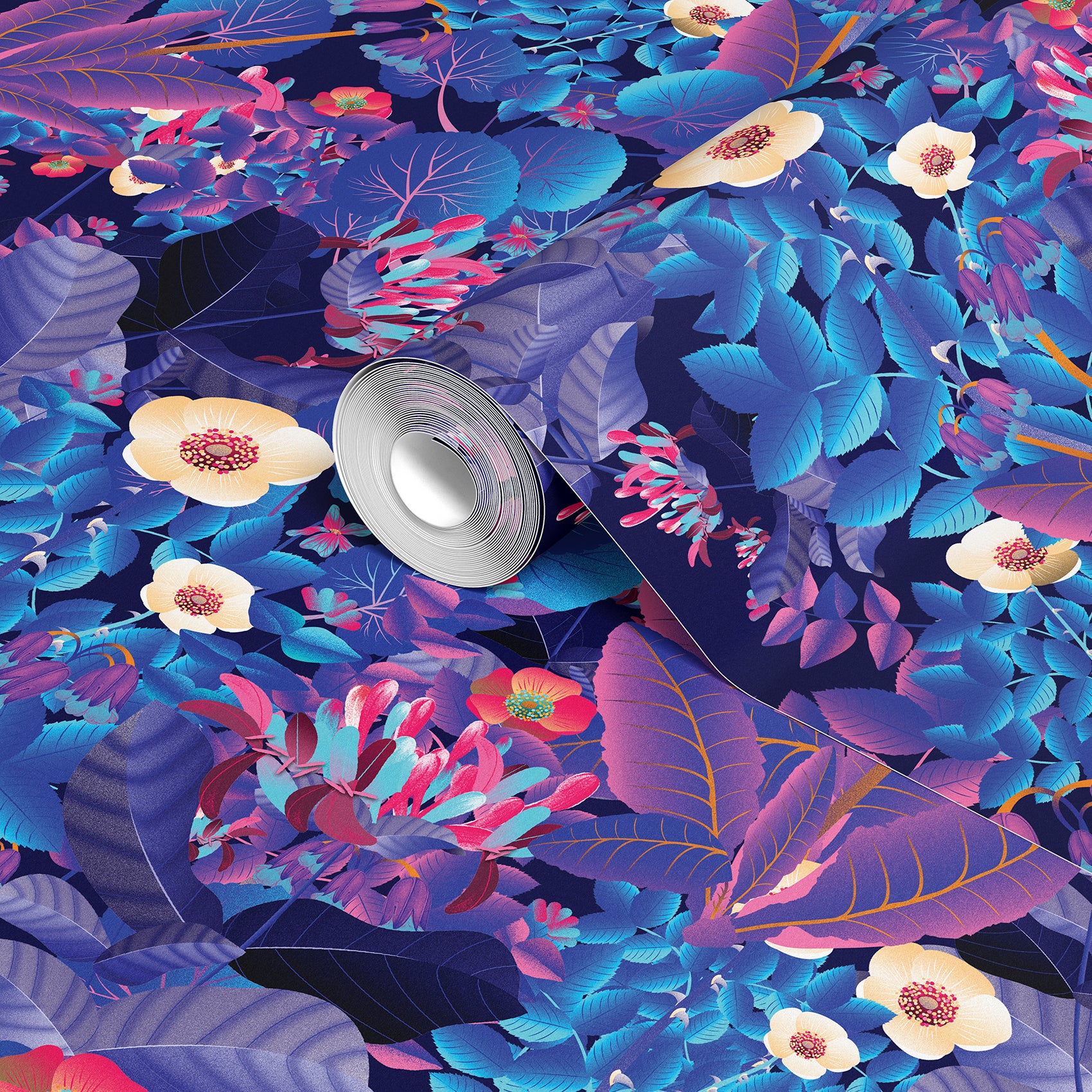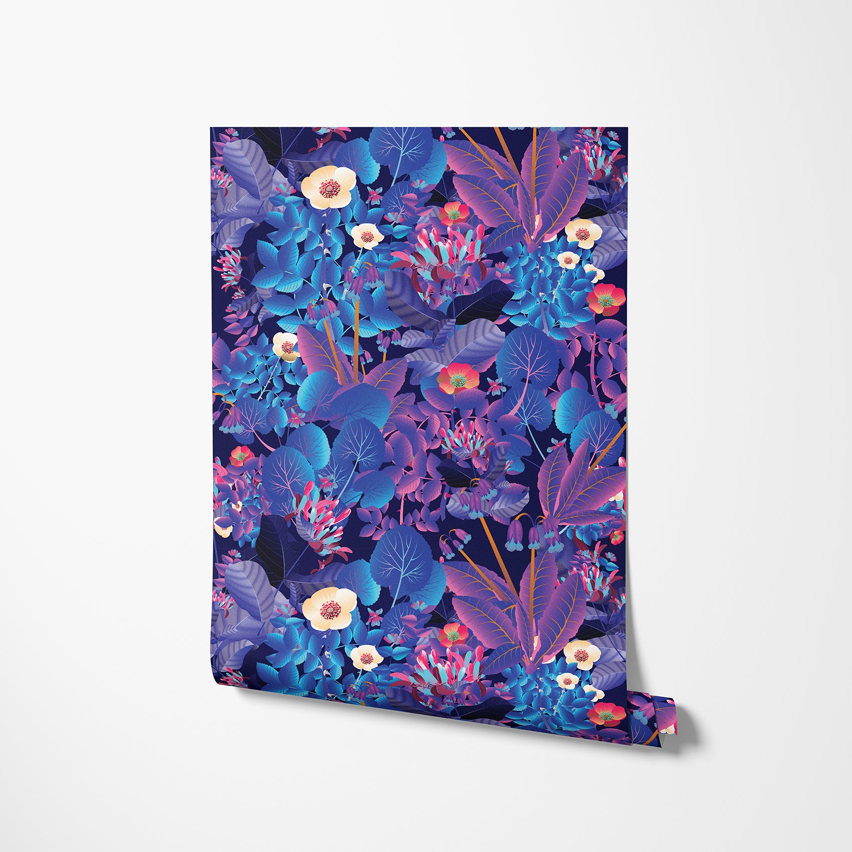 Dynamic floral wallpaper with electric blue and luminous tones for evening drama. A high-impact statement inspired by Shakespeare’s magical forest.