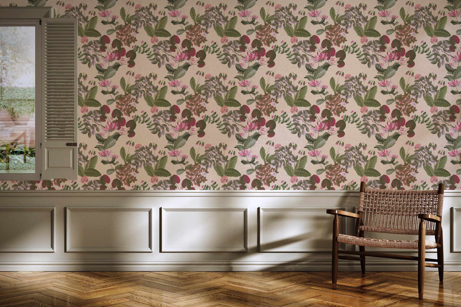 A calming floral wallpaper featuring olive green, pink, and pomegranate tones. This light version evokes Shakespearean woodland in daylight.